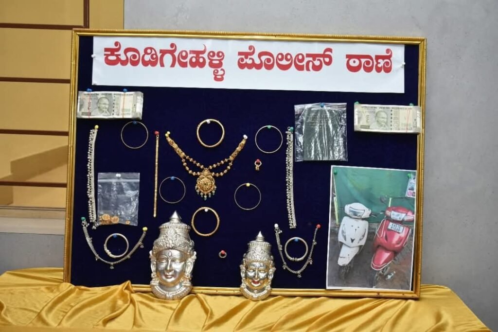 ಕೊಡಿಗೇಹಳ್ಳಿ ಪೊಲೀಸ್ ಠಾಣಾ ವ್ಯಾಪ್ತಿಯಲ್ಲಿ ಮನೆಗಳ್ಳತನದ ಆರೋಪದಡಿ ಓರ್ವ ವ್ಯಕ್ತಿಯನ್ನು ಬಂಧಿಸಲಾಗಿದೆ. ಆರೋಪಿಯಿಂದ 148 ಗ್ರಾಂ ಚಿನ್ನಾಭರಣ ಹಾಗೂ 200 ಗ್ರಾಂ ಬೆಳ್ಳಿಯ ವಸ್ತುಗಳನ್ನು ವಶಪಡಿಸಿಕೊಂಡಿದ್ದು, ಒಟ್ಟು ಮೌಲ್ಯ ₹9.20 ಲಕ್ಷ. ನಗರ ಪೊಲೀಸರು, ನಾಗರಿಕರಿಗೆ ತಮ್ಮ ಮನೆಗಳಿಗೆ ಭದ್ರವಾದ ಲಾಕಿಂಗ್ ವ್ಯವಸ್ಥೆ ಅಳವಡಿಸಲು ಹಾಗೂ ಕೀಲಿ-ಅಡಗಿಸುವ ಸ್ಥಳಗಳ ಬಳಕೆ ಮಾಡದಂತೆ ವಿನಂತಿಸಿದ್ದಾರೆ.